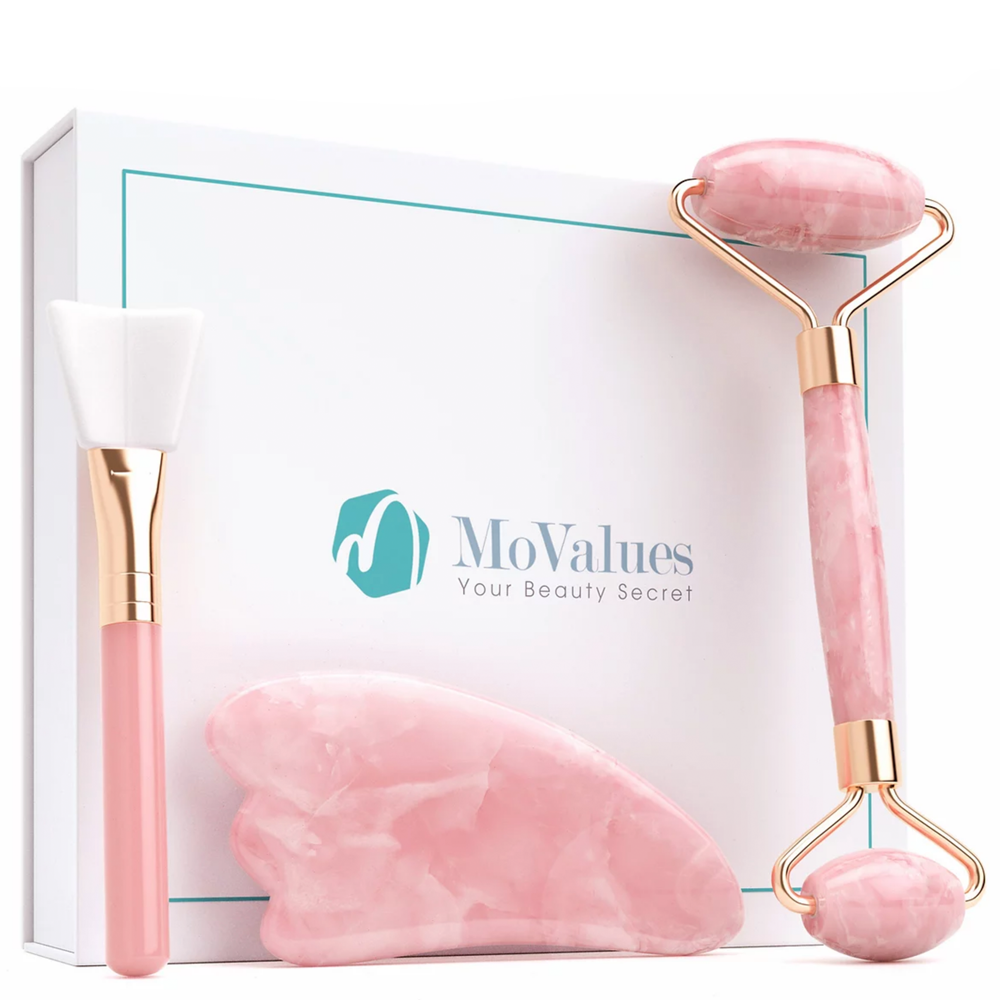Set Rodillo de Cuarzo Rosado y Gua Sha